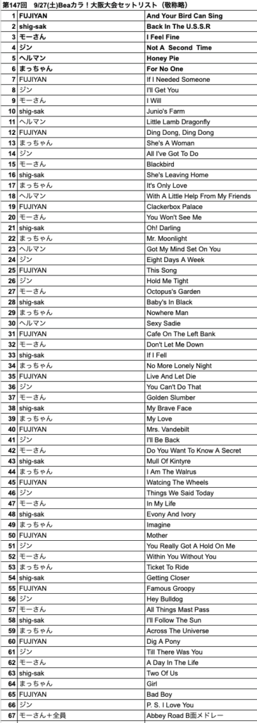 6人と参加者は少なかったのですがが、Beatlesナンバーを中心にソロ曲まで思い思いに唄い、会場は終始熱気に包まれました。